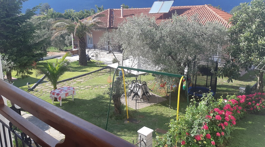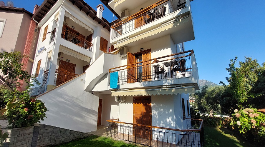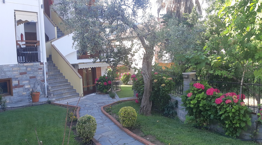 Апартманот се наоѓа на први кат и располага со две простории. Во првата просторија е кујната која е комплетно опремена со кујнски инвентар, мал фрижидер, шпорет со две рингли, аспиратор, микробранова печка, чајник и има кревет на извлекување наменет за спиење на 2 лица. Овде има плакар за алишта и клима уред. Од кујната се излегува на тераса со поглед во убав двор полн со зеленило. Втората просторија е спалната соба во која има еден дупли кревет комотен за спиење на две лица, ТВ и сеф за лични работи. И од спалната соба се излегува на тераса со поглед во убав двор со зеленило. Апартманот располага со стандардно купатило и WC со фен за коса.