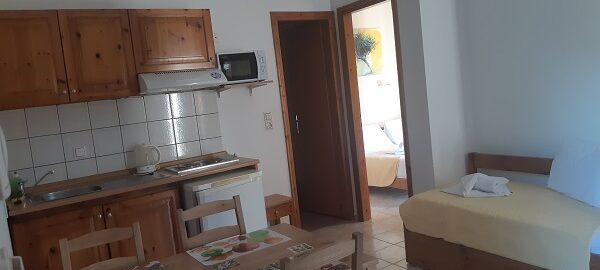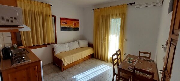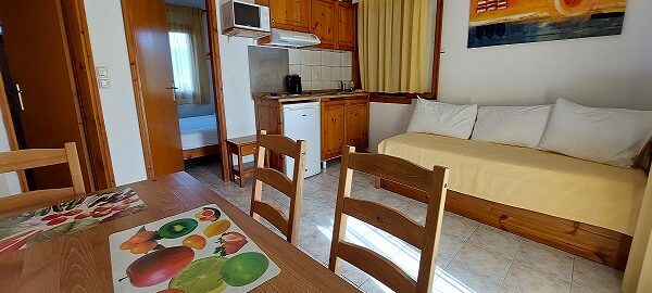 Апартманот се наоѓа на прв кат и располага со две простории. Во првата просторија е кујната која е комплетно опремена со кујнски инвентар, мал фрижидер, шпорет со две рингли, аспиратор, микробранова печка, чајник и има кревет на извлекување наменет за спиење на 2 лица. Овде има плакар за алишта и клима уред. Од оваа просторија се излегува на тераса со поглед во двор полн со зеленило. Втората просторија е спалната соба во која има еден дупли кревет комотен за спиење на две лица, ТВ и сеф за лични работи. Апартманот располага со стандардно купатило и WC со фен за коса.