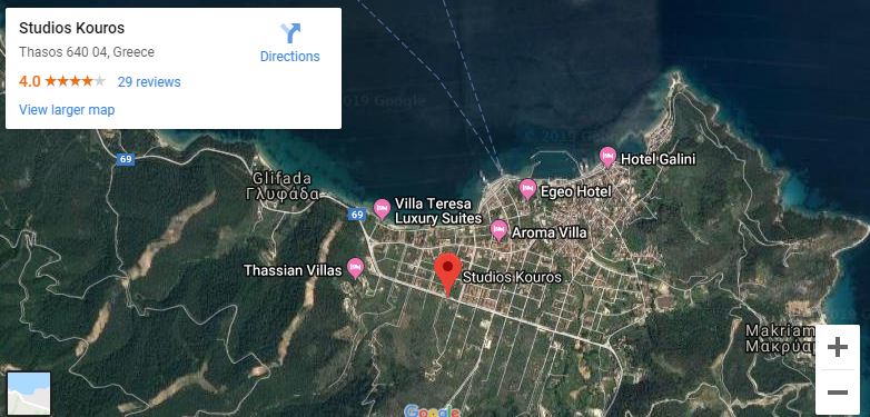 Студијата Kouros се наоѓаат на одлична локација веднаш надвор од центарот на Лименас, на панорамска локација меѓу маслинови дрвја.
