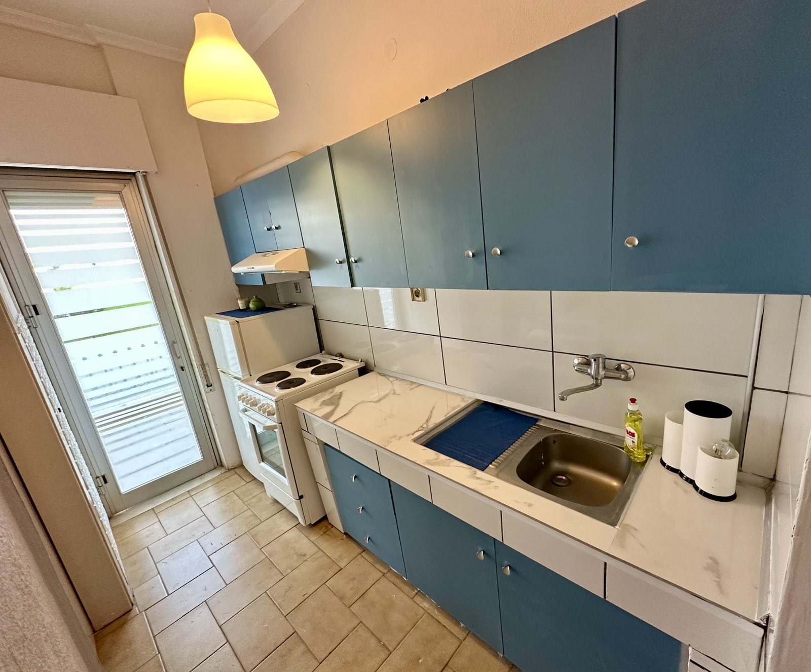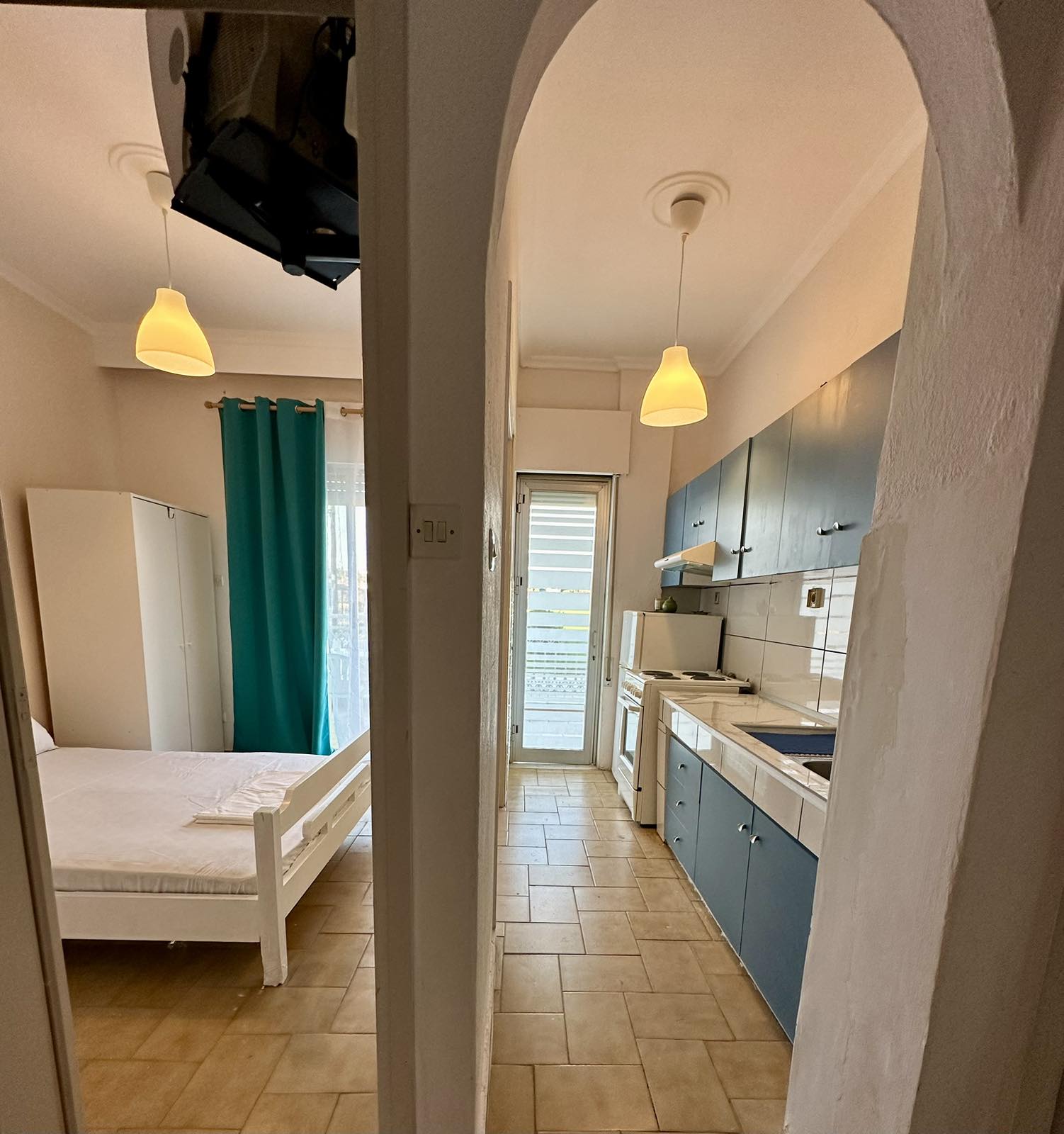 1/4 дуплекс апартман бр. 1 – високо приземје. Простран дуплекс апартман кој располага со три посебни простории: 2 одвоени спални соби, од кои во едната има брачен кревет, а во другата 2 стандардни единечни кревети и од двете спални соби се излегува на сопствена тераса. Одвоена опремена кујна со сите потребни елемнти (голем фрижидер, голем шпорет со рерна, кујнски прибор, електричен бокал за вода и сл.) и сопствен реновиран тоалет со туш. Опремен е со квалитетен реновиран мебел за лето 2026, 2 клима уреди, ТВ, Wi-Fi.
