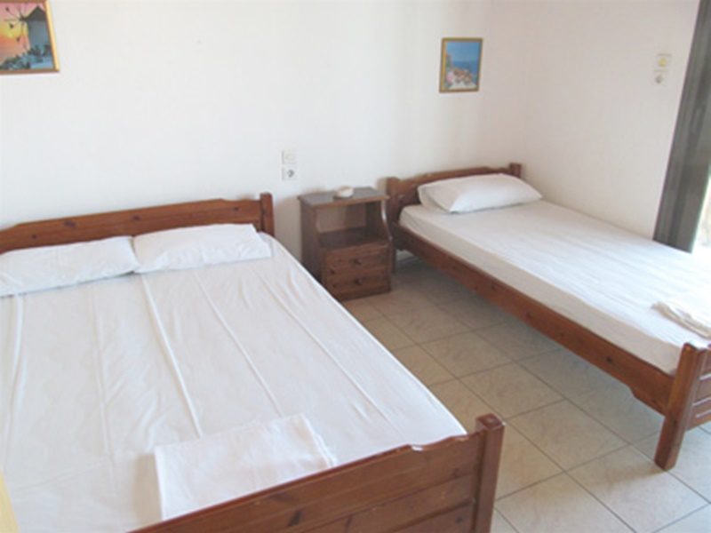 Апартманот располага со две спални соби меѓусебно одвоени со зидче без врата + кујна комотна и комплетно опремена со кујнски инвентар,електрично решо,голем фрижидер.Во едната спална соба има дупол кревет и поединечен кревет,клима уред и излегува на тераса со поглед на море.Втората спална соба има еден дупол кревет ,плакар за алишта,тв и излегува на тераса со поглед на море. Апртманот има стандардно купатило и вц.