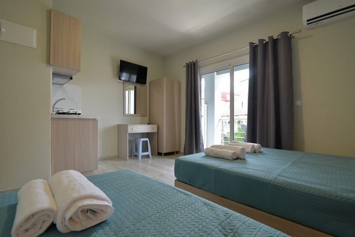 Сите студиа се трокреветни со едно дупло легло и едно еднинечно легло, опремени со мини кујна со прибор за готвење и јадење, ТВ, Клима (со доплата 7еур на ден) интренет, балкон со гарнитура за седење, балконите на двете студиа кој се ориентирани према море се поголеми, од тие кој се ориенирани со поглед према планина.