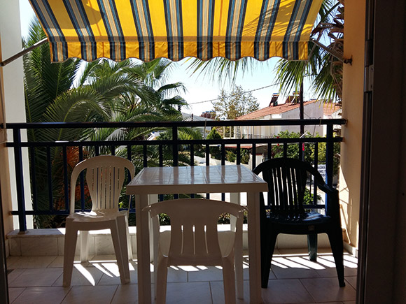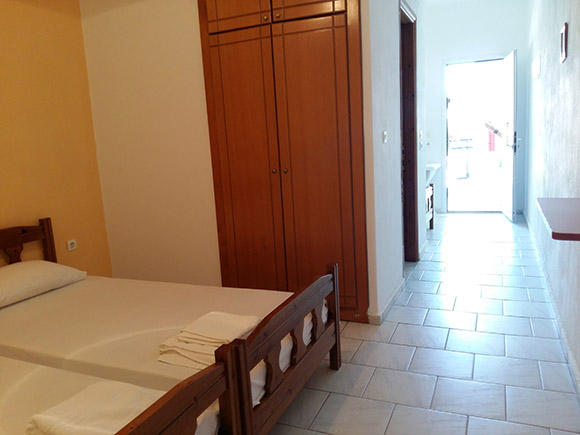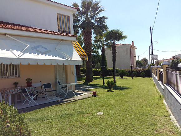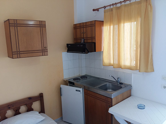 Апартманот располага со две простории. Првата просторија е кујната која е комплетно опремена со кујнски инвентар, решо со две рингли, аспиратор, фрижидер и има 1 поединечен кревет. Во втората просторија има 2 поединечни кревети, плакар за алишта, тв, клима и излегува на тераса на која има маса со столици и тенда, со поглед во убавата градина. Помеѓу двете простории нема врата. Има комарници и ролетни на прозорите. Апартманот располага со стандардно купатило и вц.